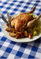 This is like a roasted version of a posh chicken kiev. Put any vegetables you fancy in the roasting tin – we love to have leeks, celery and new potatoes. We have never saved roast chicken for the weekend as it is so simple to do, making it easy to serve up a gorgeous meal easily, any day of the week.